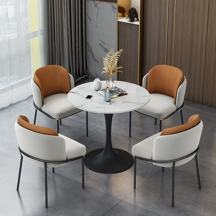 - Chất liệu: Mặt bàn đá, chân thép sơn tĩnh điện; Ghế bọc vải hoặc da, chân thép sơn tĩnh điện.