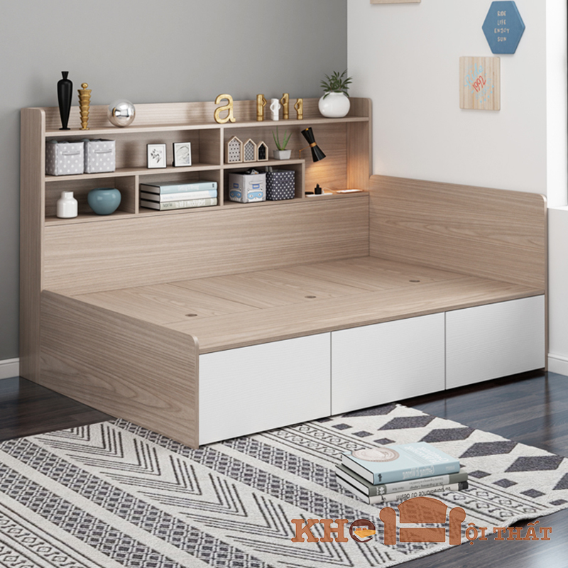 - Phụ kiện: Có kệ để đồ và hộc kéo bên hông giường.