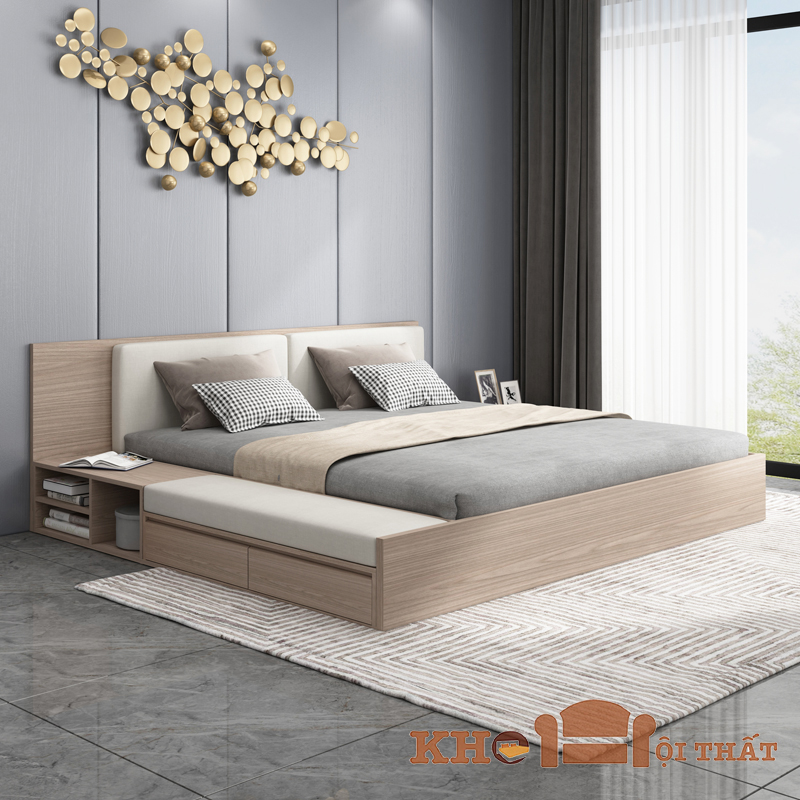 - Phụ kiện: Có băng ghế bọc nệm và hộc kéo bên hông giường.