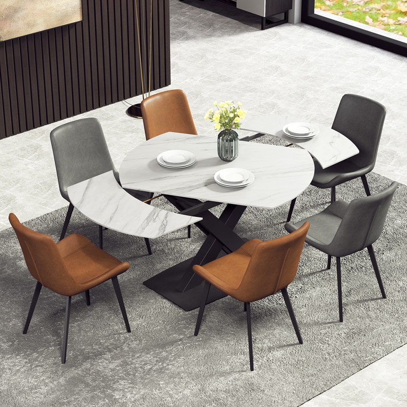 Mặt bàn ăn đá ceramic trắng vây mây hiện đại với thiết kế sang trọng. Đường kính bàn ăn 1.35m, lúc thu nhỏ còn 0.8x1.35m