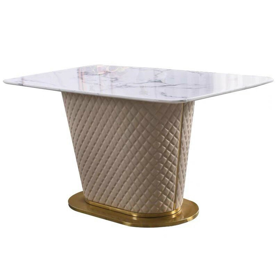 Bàn ăn chân bọc da mặt đá sang trọng B-12 mặt đá hiện đại với thiết kế công nghiệp với các vân mây bóng tươi sáng tạo điểm nhất. Đặc biệt, chân bàn thép sơn tĩnh điện bọc da kết hợp đế inox mạ vàng sang trọng thời thượng vừa bền bỉ vừa nâng cao tính thẩm mỹ cho căn bếp.