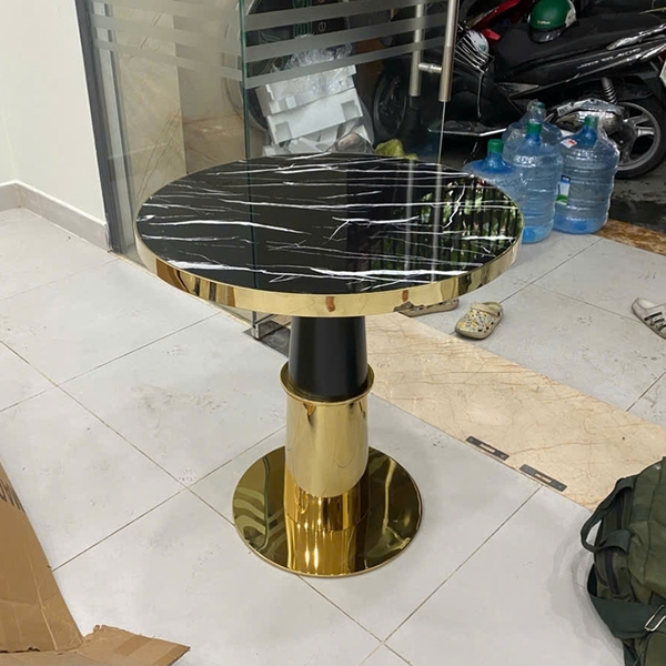 - Chất Liệu: Mặt bàn là đá ceramic - một vật liệu vững chắc, chống trầy xước và dễ dàng vệ sinh. Khung phần vàng được làm từ inox mạ vàng, mang lại độ bền và tính thẩm mỹ cao, trong khi phần trụ trên là sắt sơn tĩnh điện, giúp sản phẩm có độ ổn định và chắc chắn.