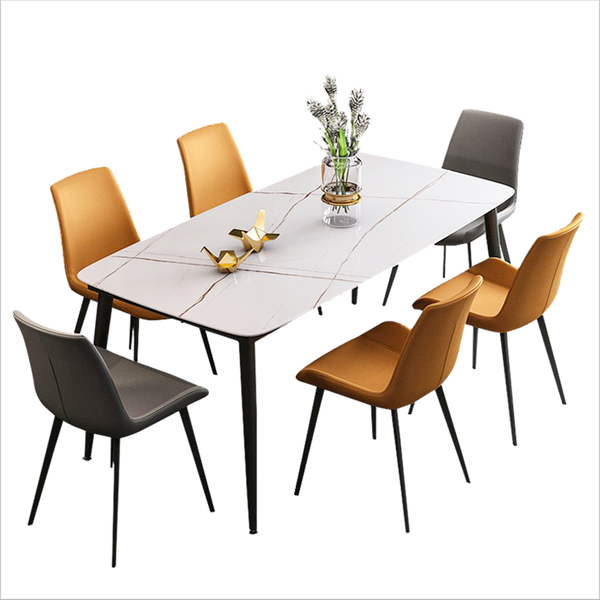 Về kiểu dáng thì bàn có hình chữ nhật kèm theo 6 ghế đi cùng. Do đó, sản phẩm rất phù hợp dùng trong các bữa tiệc nhỏ gặp mặt gia đình. Với chất liệu đá cao cấp, chống thấm, chống trầy xước bởi các tác động mạnh vào mặt bàn. Bên cạnh đó, chân bàn được làm từ thép tĩnh điện nên khả năng chịu lực rất tốt.