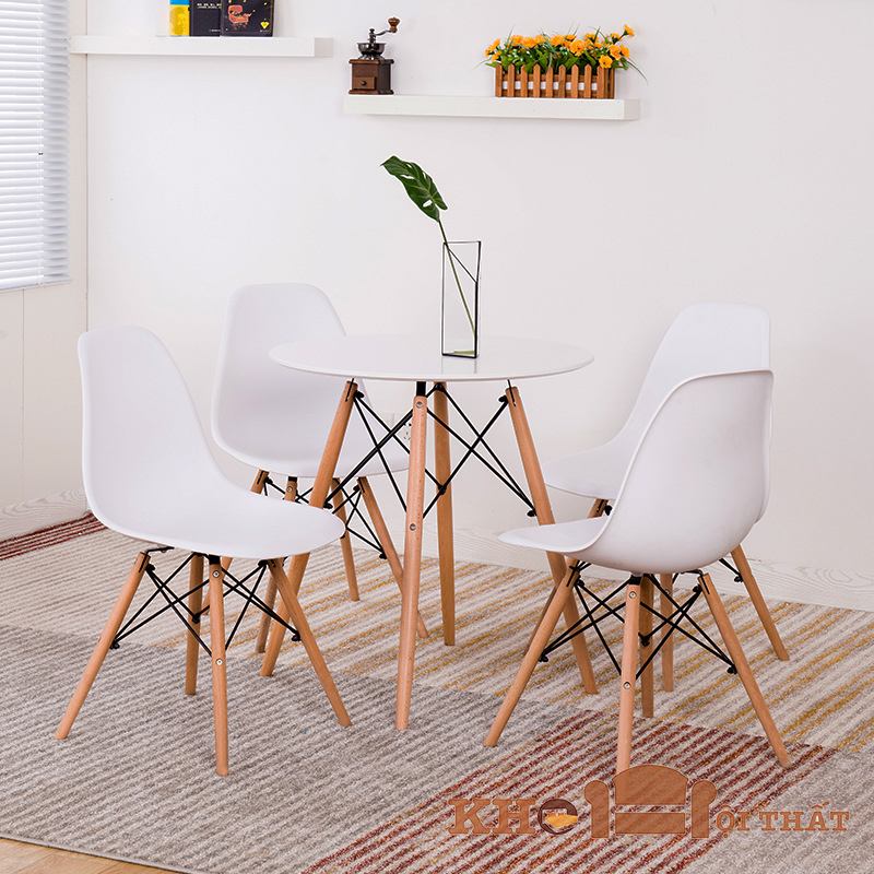 Bộ bàn ăn, cafe hiện đại cho 4 người gồm bàn tròn 4 chân và 4 ghế cafe eames BBC-28 được nhập khẩu và phân phối bởi Kho Nội Thất Sài Gòn là lựa chọn thông minh của đối với các bạn trẻ, những gia đình trẻ. Với thiết kế hiện đại, nhỏ gọn bộ bàn ghế hiện đại 4 chổ ngồi này sẽ đáp ứng được nhu cầu sử dụng của bạn trong những không gian nhỏ như chung cư, văn phòng, cửa hàng, showroom…