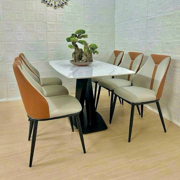 Mẫu bàn ăn này gồm 6 ghế và mặt đá nhập khẩu được thiết kế phần chân bàn chữ X trụ vừa tạo tính thẩm mỹ vừa giúp nâng đỡ mặt bàn một cách chắc chắn.