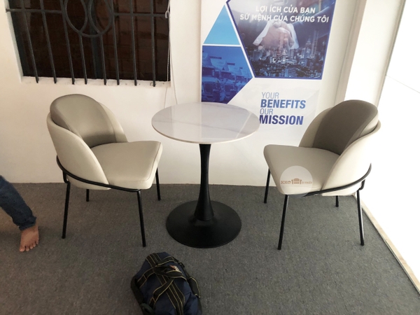- Bộ bàn ghế cafe 2 ghế nhỏ gọn BBC-13 bao gồm 1 bàn Tulip mặt đá sang trọng và 2 chiếc ghế. Ghế được làm từ chất liệu vải hoặc da phong cách trẻ trung, êm ái mang lại sự thoải mái cho người ngồi, từ đó tạo sự gần gũi cho giữa khách hàng và người tiếp khách giúp công việc thuận lợi, trôi chảy hơn. Kích thước bàn và ghế được thiết kế hết sức cân đối, hài hòa.