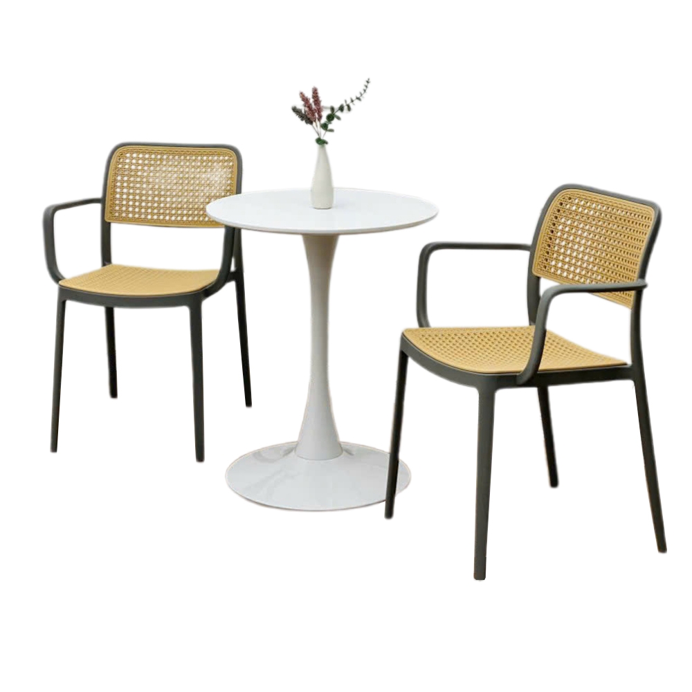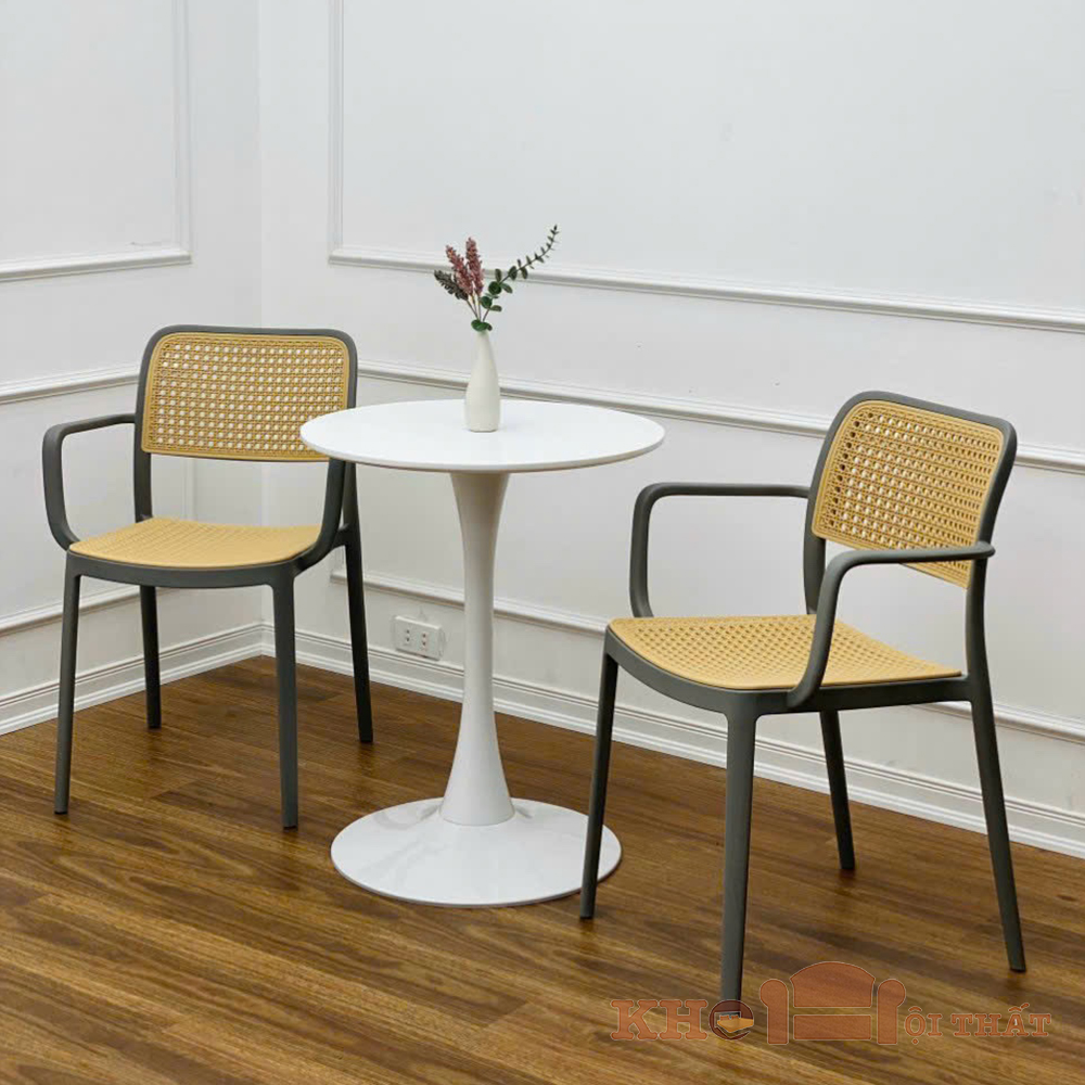 Bộ bàn ghế cafe tiếp khách 2 ghế nhựa giả mây có tay BBC-17 sẽ giúp không gian nội thất cafe, showroom, cửa hàng, văn phòng cũng như gia đình thêm tươi mới. Hơn thế nữa, sản phẩm còn mang tới vẻ đẹp hiện đại sang trọng, tăng sự hào hứng, củng cố sự chuyên nghiệp cho không gian nội thất của khách hàng.