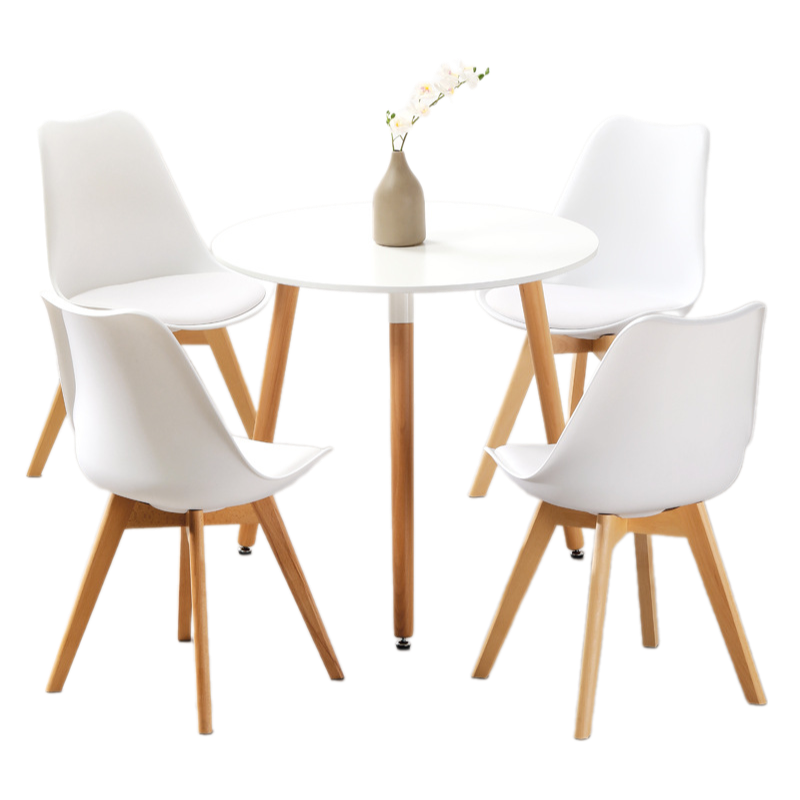 - Chất liệu: Bàn: Mặt gỗ MDF sơn phủ composite, chân gỗ beech; Ghế: nhựa PP lót nệm chân gỗ beech